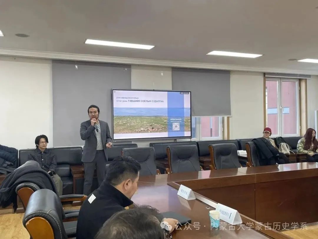 座谈前,蒙古国科学院考古研究所巴图宝力道、嘎拉丹两位学者为蒙古历史学系师生分别做了《蒙古国戈壁地区考古研究新成果》和《蒙古国东南部地区的特布希文化研究》两场讲座。